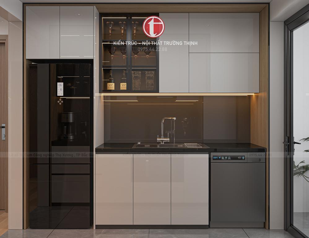 tủ bếp hiện đại với nhiều ngăn lưu trữ, giúp việc nấu nướng trở nên thuận tiện và khoa học. Tông màu trung tính kết hợp mặt bếp tối màu tạo sự hài hòa và sạch sẽ.