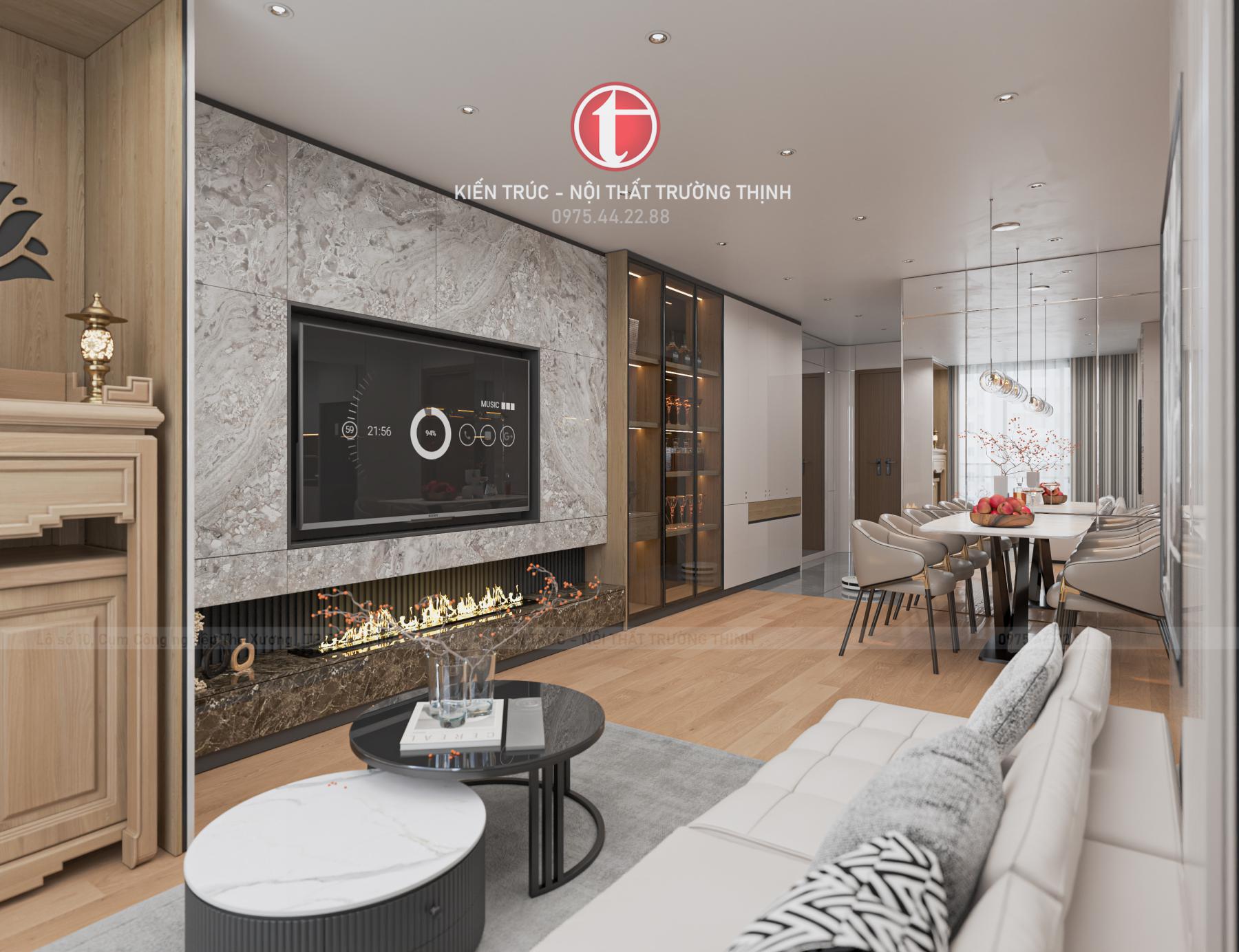 Mảng tường tivi được xử lý bằng vật liệu trang trí kết hợp hệ tủ trưng bày và ánh sáng led, tạo điểm nhấn cho toàn bộ không gian. Thiết kế mở giữa phòng khách và khu vực bàn ăn cũng giúp căn hộ trở nên rộng rãi và kết nối hơn.