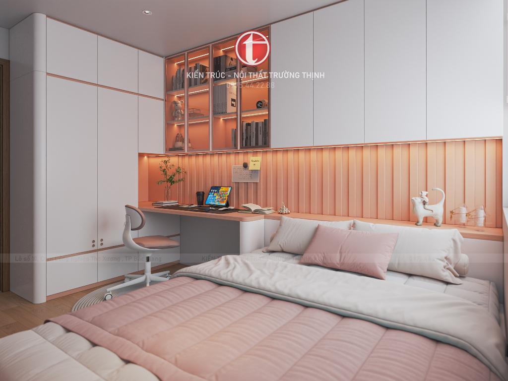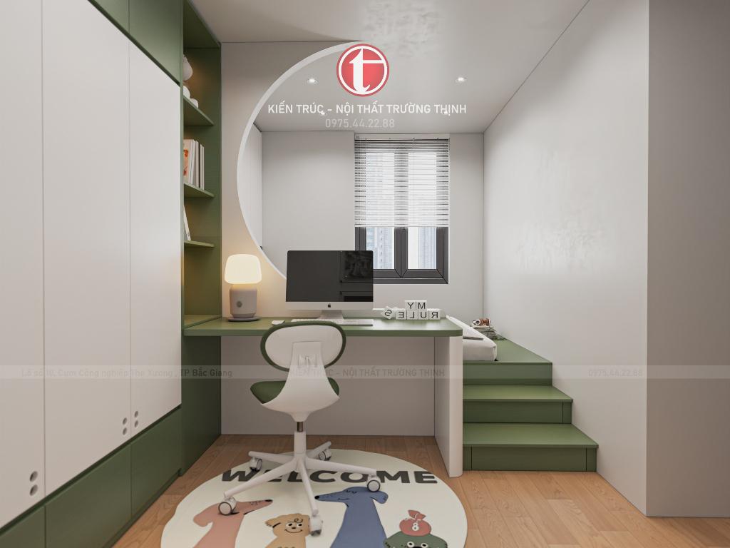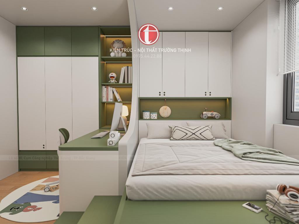 Phòng ngủ trẻ em được bố trí linh hoạt với giường ngủ, bàn học và hệ tủ lưu trữ, tạo nên không gian sinh hoạt và học tập tiện nghi cho trẻ. Trong khi đó, phòng ngủ phụ được thiết kế đơn giản nhưng vẫn đầy đủ công năng, phù hợp làm phòng cho khách hoặc người thân.