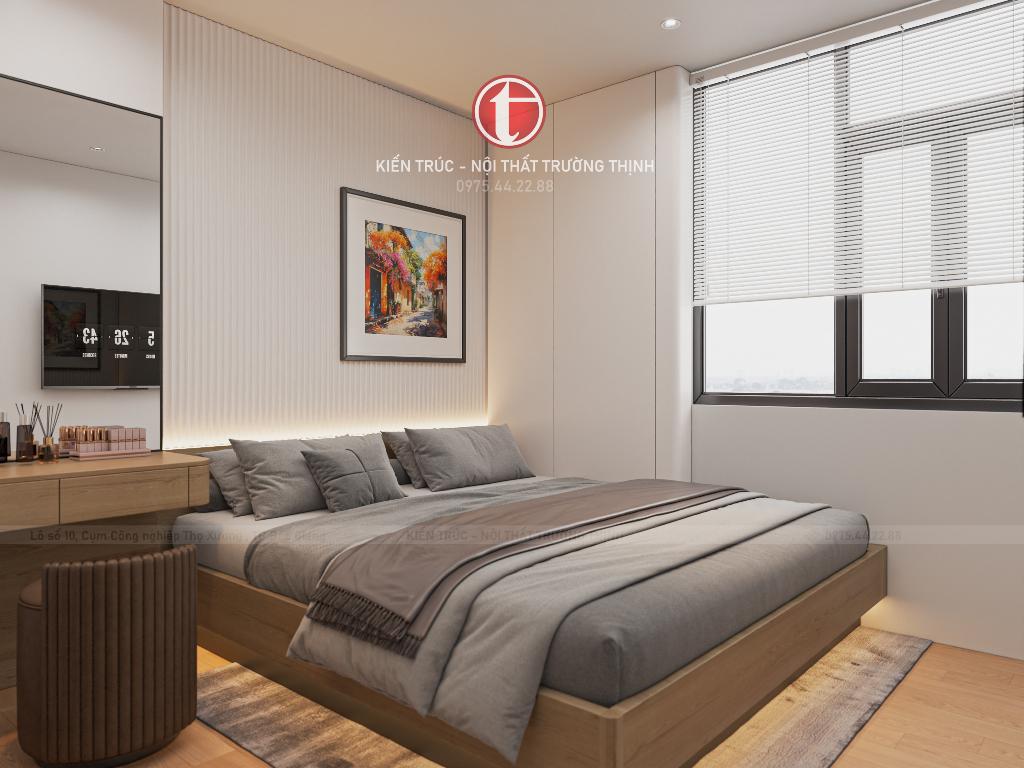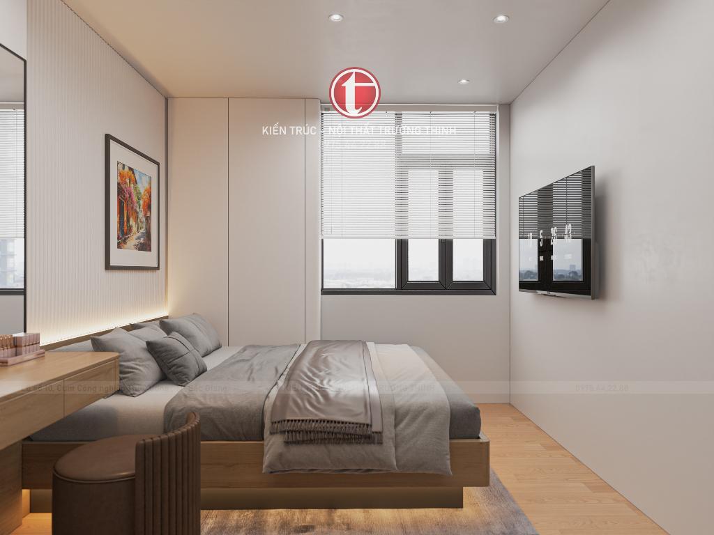 Phòng ngủ master được thiết kế với phong cách nhẹ nhàng, tập trung vào sự thư giãn. Hệ tủ quần áo âm tường giúp tiết kiệm diện tích và giữ cho không gian luôn gọn gàng.